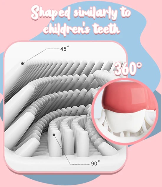 Ergonomic U-shaped brush head, suitable for the shape and mechanics of children's teeth structure. uniquely designed for children's tender gums and sensitive teeth.